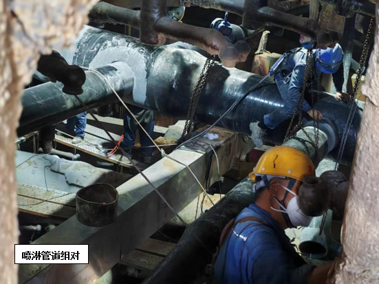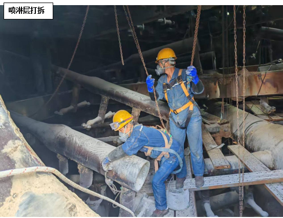 維修方案確定后,攀藍鼎立即開始著手噴淋管道采購預(yù)制工作,考慮到目前燒結(jié)產(chǎn)能不飽和,系統(tǒng)多處停機的因素,決定預(yù)制管道到廠后由檢修進行拆除及更換,只保留技術(shù)性要求較高的玻鋼粘接由專業(yè)施工人員來完成。7月24日,在材料到廠后,檢修立即開始在塔內(nèi)布置安全措施,并進行噴淋層打拆工作,打拆過程中檢修對切下的三通支管進行仔細甄別,磨損嚴重的進行報廢處理,還具備使用價值的作為備件歸置,以確保物盡其用。打拆完畢后,檢修隨即進行管道吊裝及內(nèi)部組裝配管工作,配管完成后防腐單位開始進場作業(yè),在此過程中檢修全程安排人員進行組對及工程質(zhì)量監(jiān)督工作,并及時撤場收尾。